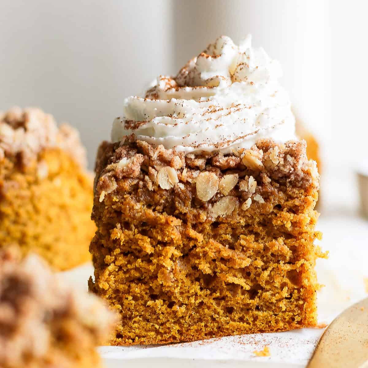 - Transfer the batter to the baking dish and top with the streusel topping. Bake the cake for 20 minutes, cover it with a tin foil tent, and bake for another 20 minutes. Remove the cake from the oven if the middle of the cake is mostly baked (it will continue to bake for a few minutes after you remove it from the oven).
