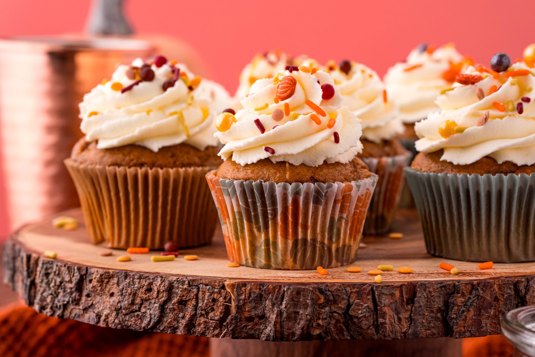 6. Once cupcakes are cooled, pipe the frosting on top and garnish with sprinkles or a dusting of pumpkin pie spice if desired.