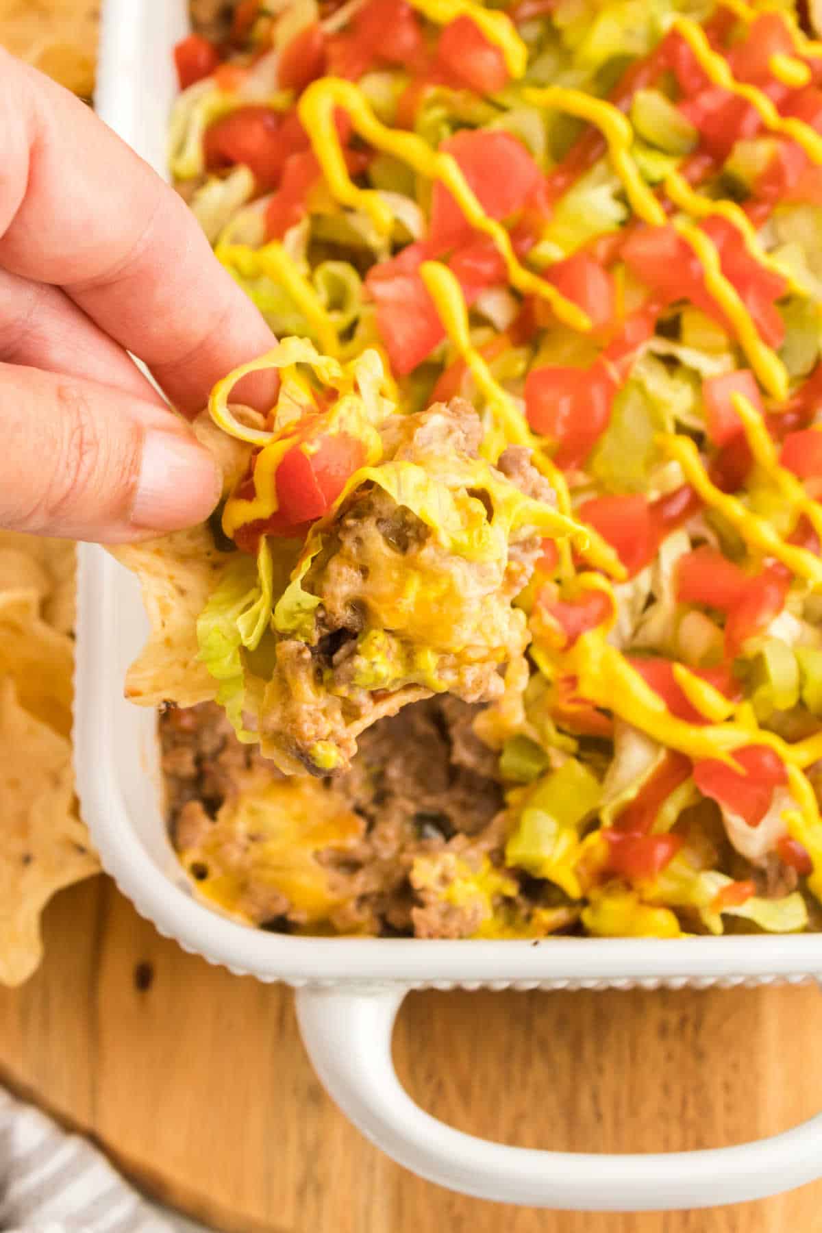 - Remove from oven. Top with lettuce, pickles, and tomatoes. Drizzle on ketchup and mustard. Serve hot with tortilla chips.