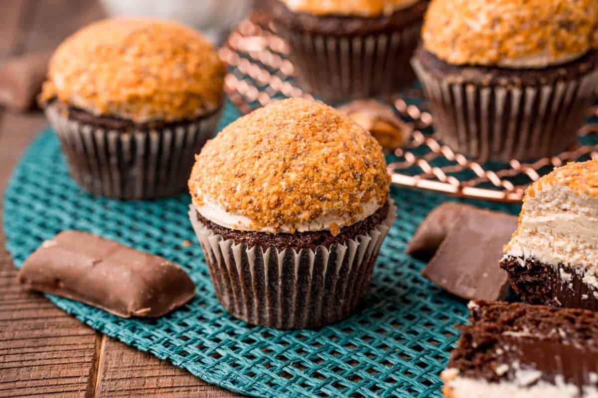 - Gently turn the cupcake upside down into the bowl of crushed butterfinger candies, lightly pressing onto the frosting.