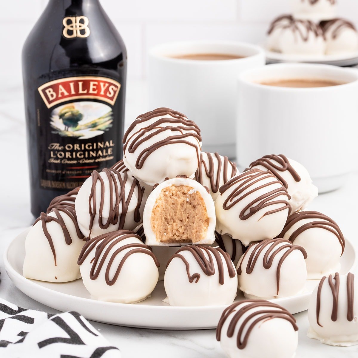 - Using a small spoon, or a small piping bag filled with melted milk chocolate, decorate the vanilla-coated Baileys cheesecake balls with a drizzle of the milk chocolate.
