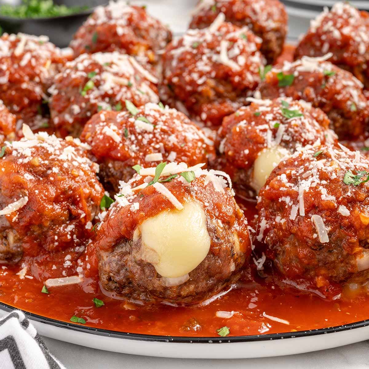 Delicious homemade mozzarella stuffed meatballs baked to perfection, served with marinara sauce.