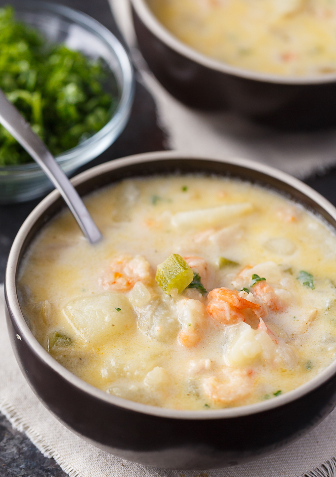 A delicious and creamy shrimp chowder perfect for cold days. Loaded with fresh shrimp, potatoes, and seasoned to perfection.
