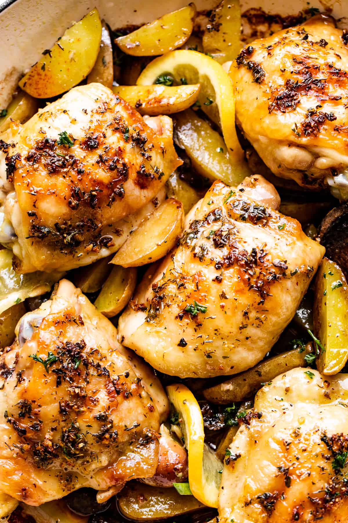 - Place the seasoned chicken thighs over the potatoes and mushrooms in the baking dish.