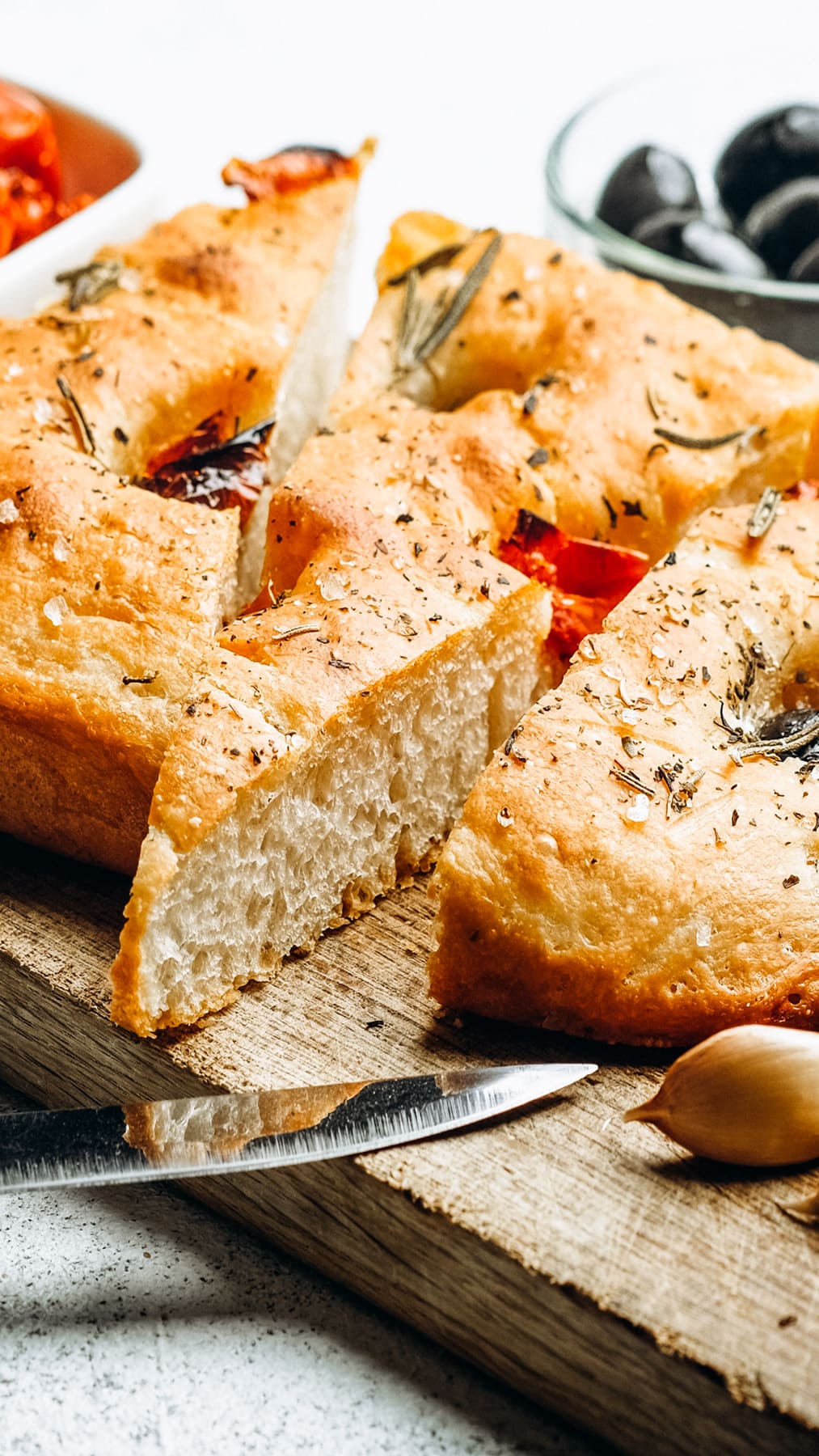 This focaccia is perfect as an appetizer or side dish, loaded with flavorful toppings.