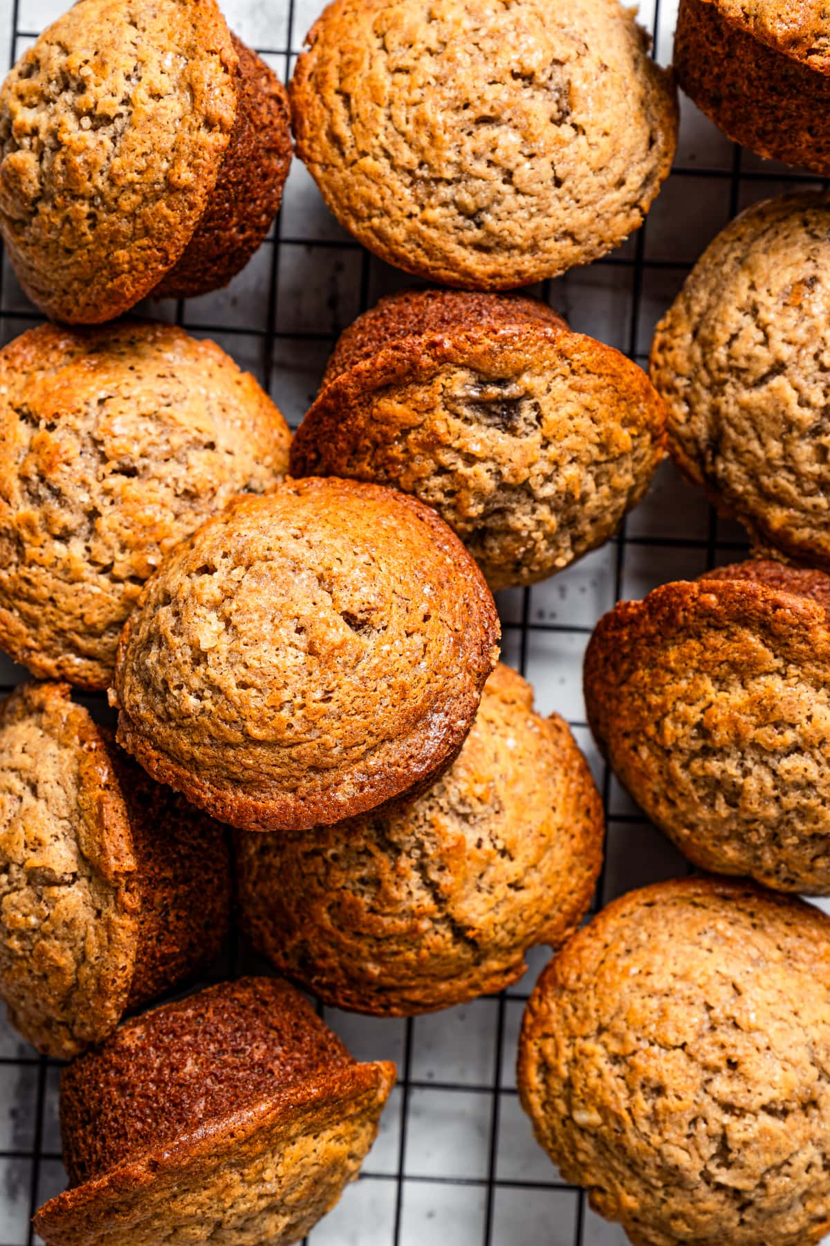 - Spoon the batter into the prepared muffin tin, filling each cup almost to the brim. Brush the tops of the muffins with melted butter and sprinkle a liberal pinch of raw cane sugar over each.