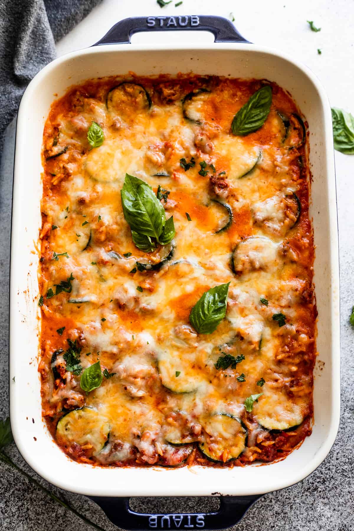 - Transfer mixture to prepared baking dish and top with remaining mozzarella.