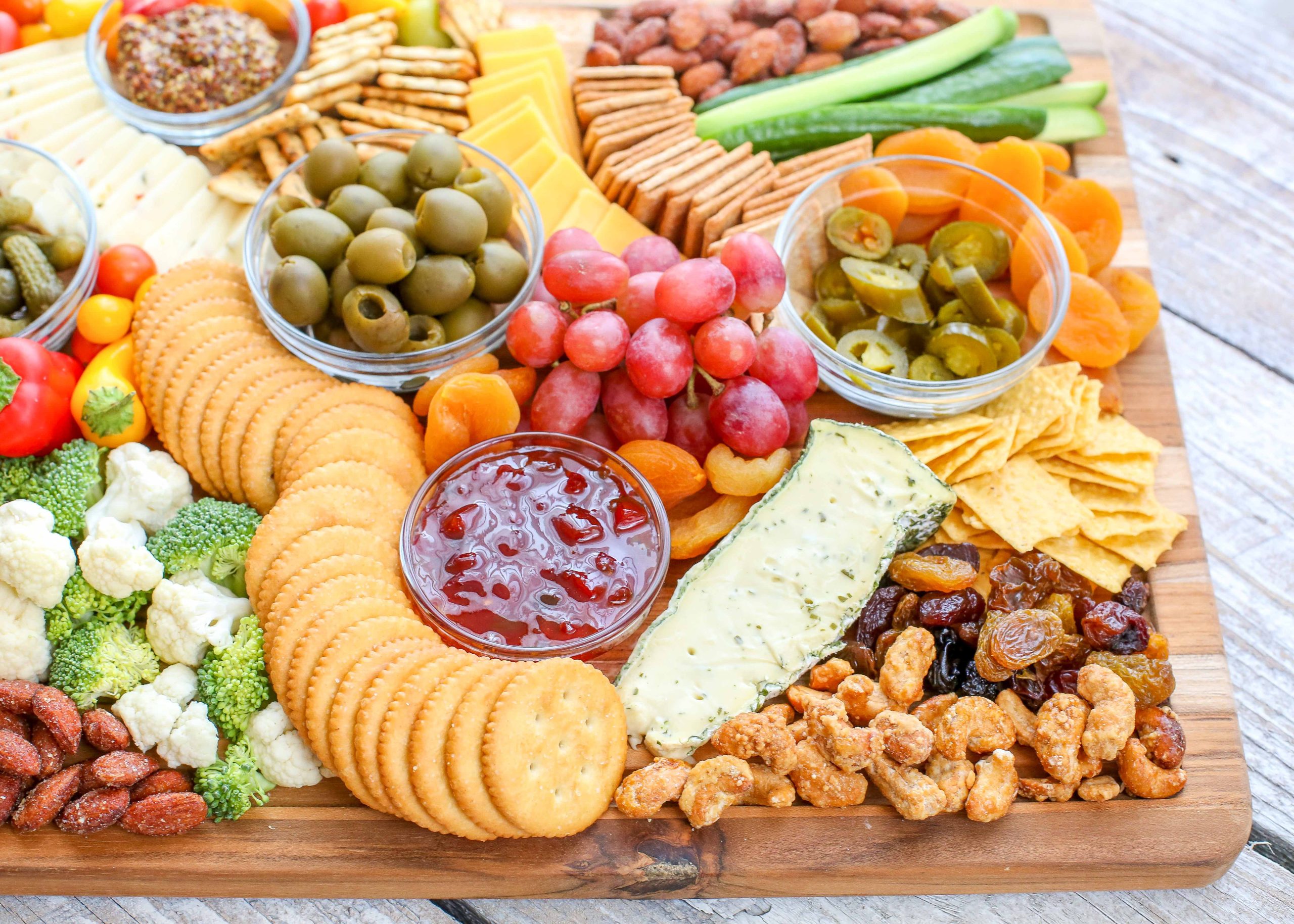 - Add fresh vegetables like cucumbers and grape tomatoes, and scatter grapes and nuts across the board to fill in gaps.
