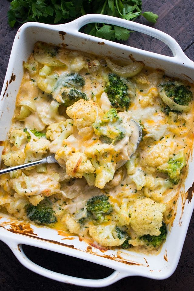 - Combine. Pour the cheese sauce over the broccoli and cauliflower; stir to combine. Sprinkle the remaining 0.25 cup cheddar cheese and 0.25 cup mozzarella cheese over the top.