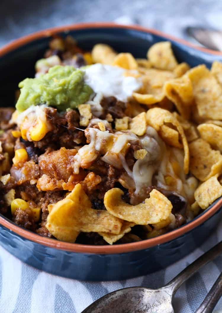 - Garnish with remaining Fritos and serve hot. Optional: top with sour cream and guacamole.