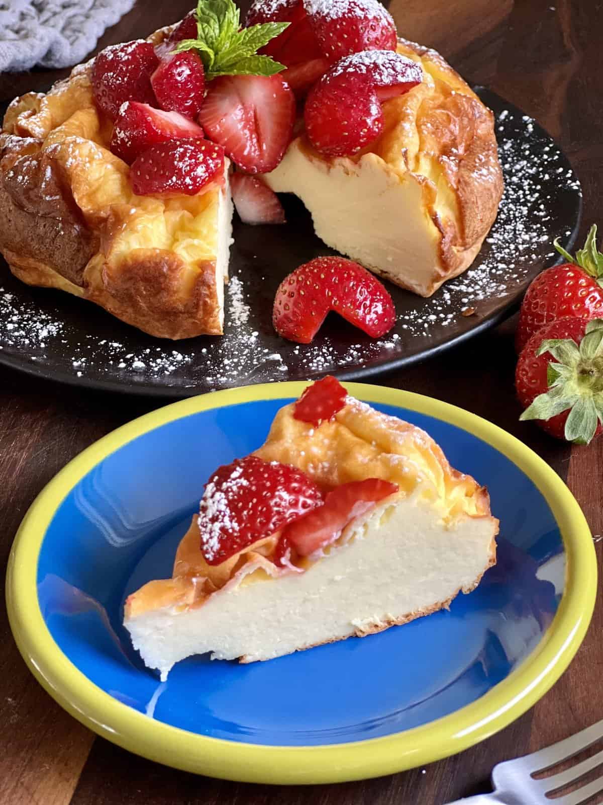 - *PLEASE NOTE: this recipe is a no sugar added cake. It has a custard like texture. If you want to add sugar to the cake that's cool too, just add 1/4 cup to the yogurt in the beginning and mix it in before adding in the eggs. You can also sub in Vanilla Greek Yogurt for some sweetness.