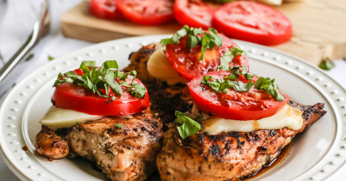 - During the last 2-3 minutes of grilling, top each chicken breast with slices of fresh mozzarella and tomato. Close the grill lid to allow the cheese to melt slightly and the tomatoes to warm through.