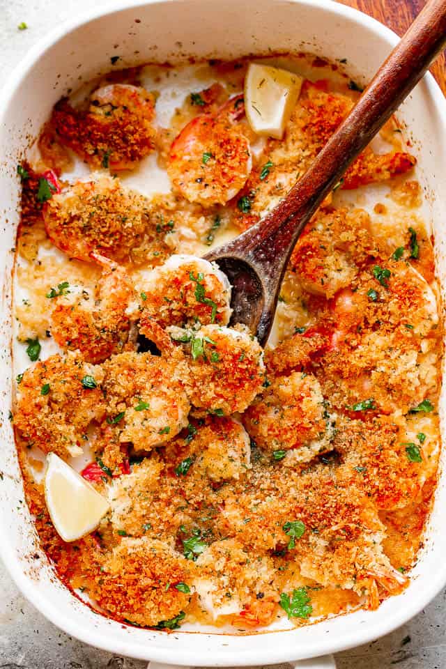 A delicious and easy baked shrimp scampi recipe with garlic butter and crispy panko topping, perfect for a quick dinner.