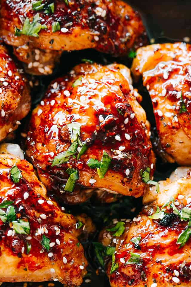 - Serve the chicken thighs topped with sesame seeds and chopped cilantro. Drizzle with thickened sauce.