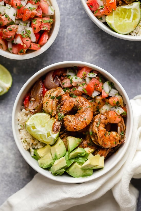 - Place 0.75 cup rice in each of 4 bowls. Evenly divide the shrimp, veggies, salsa and sliced avocado among each bowl and serve.