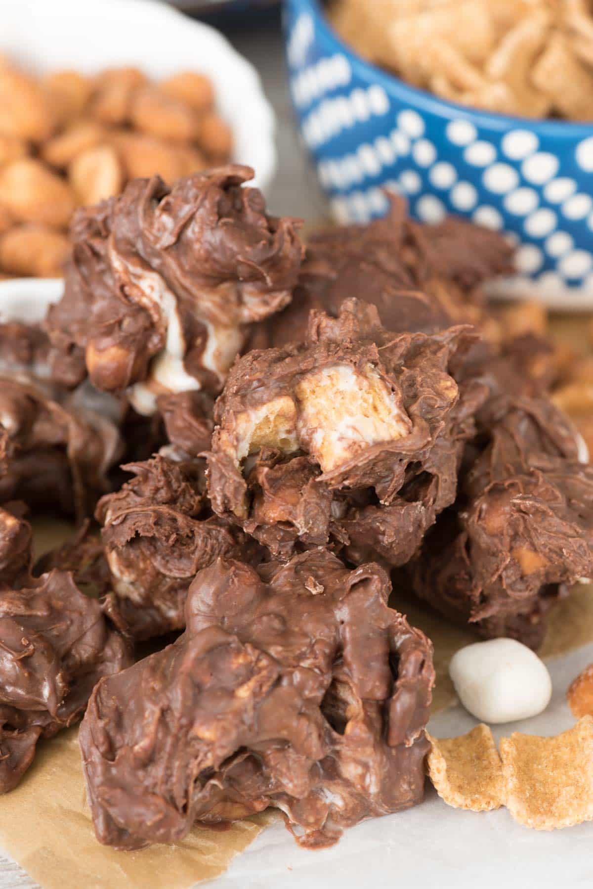 - Stir to combine the nuts, cereal, and chocolate, then gently stir in the marshmallows.