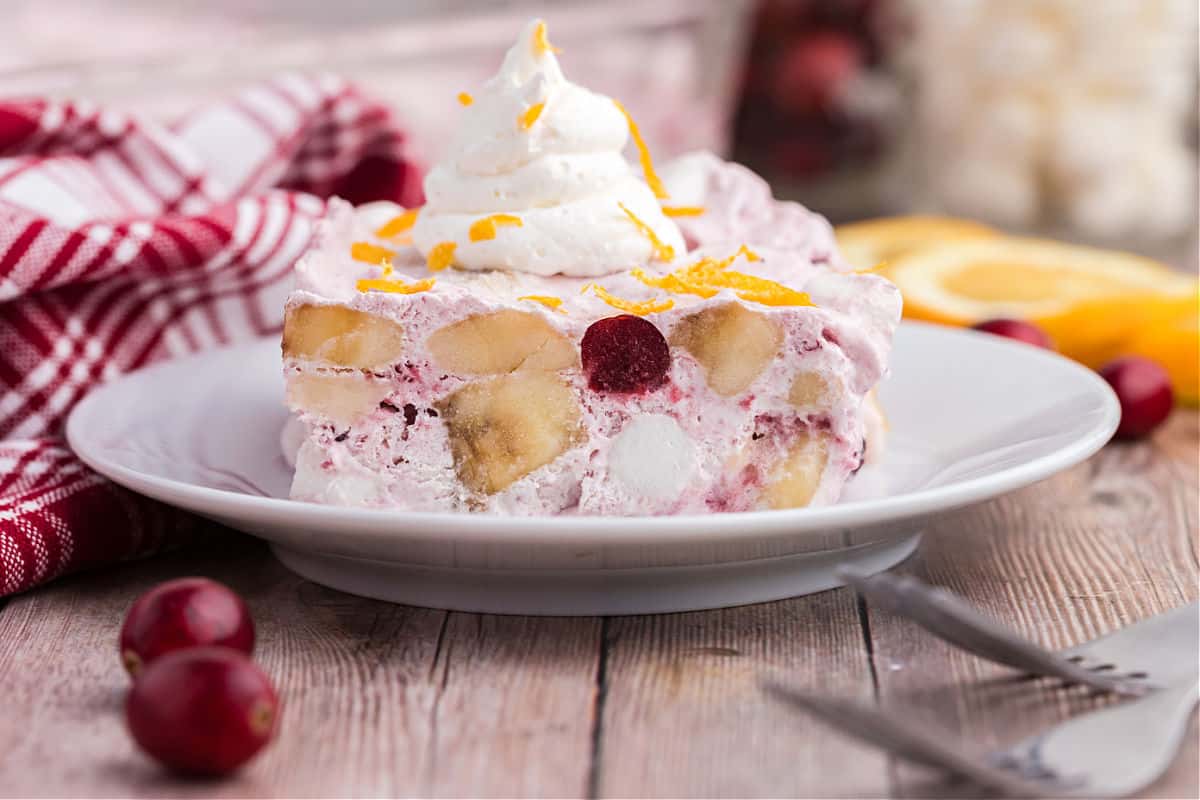 - In a large bowl, combine cranberry sauce with sugar. Add bananas, pineapple, and marshmallows. Fold in Cool Whip. Pour into a glass 13x9 inch baking dish.