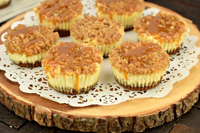 - Bake cheesecakes at 325°F for 25 minutes. Chill for at least 3 hours or overnight. Before serving, drizzle with caramel sauce.