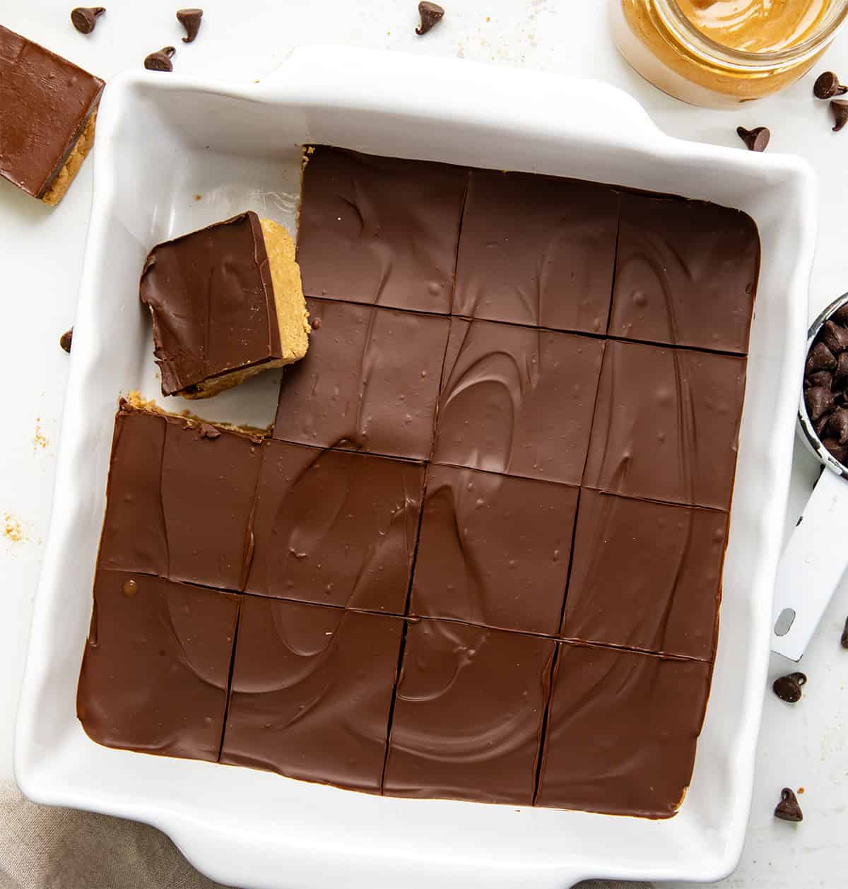 Lunch Lady Peanut Butter Bars are a no-bake treat with a graham cracker and peanut butter base topped with a chocolate peanut butter topping.
