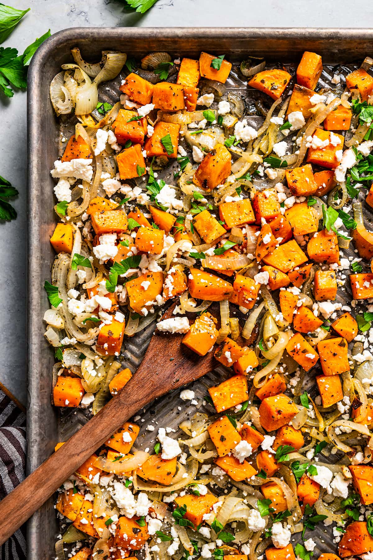 - In a bowl, toss the cubed sweet potatoes and sliced onions with olive oil. Season with salt, pepper, and oregano, then transfer to the baking dish in a single layer.