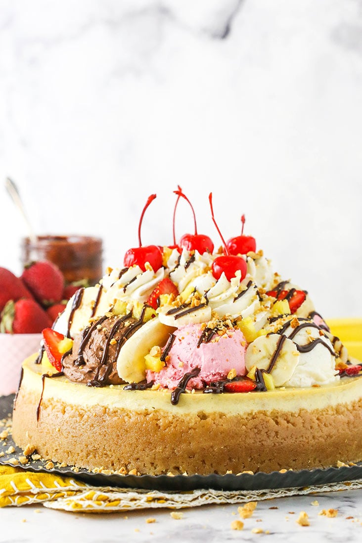 - Spread scoops of whipped cream on cheesecake, add toppings, pipe vanilla whipped cream on top.