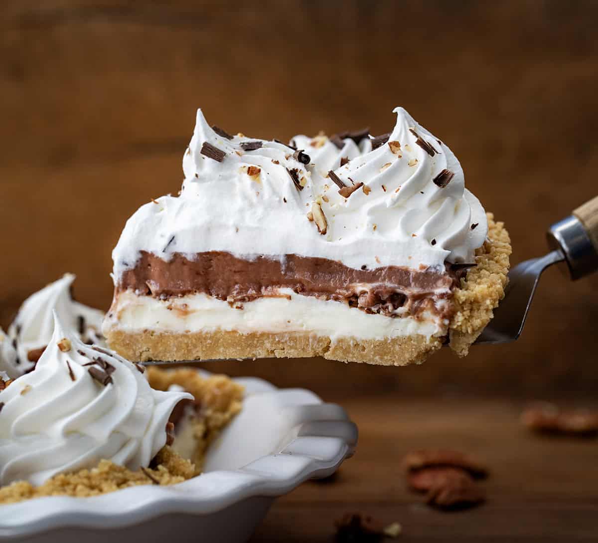 - In a separate large bowl, combine the chocolate pudding mix, vanilla pudding mix, milk, and vanilla. Using a hand mixer, beat the mixture for about 2 minutes, or until thickened. Spread the pudding mixture evenly over the pecan layer.