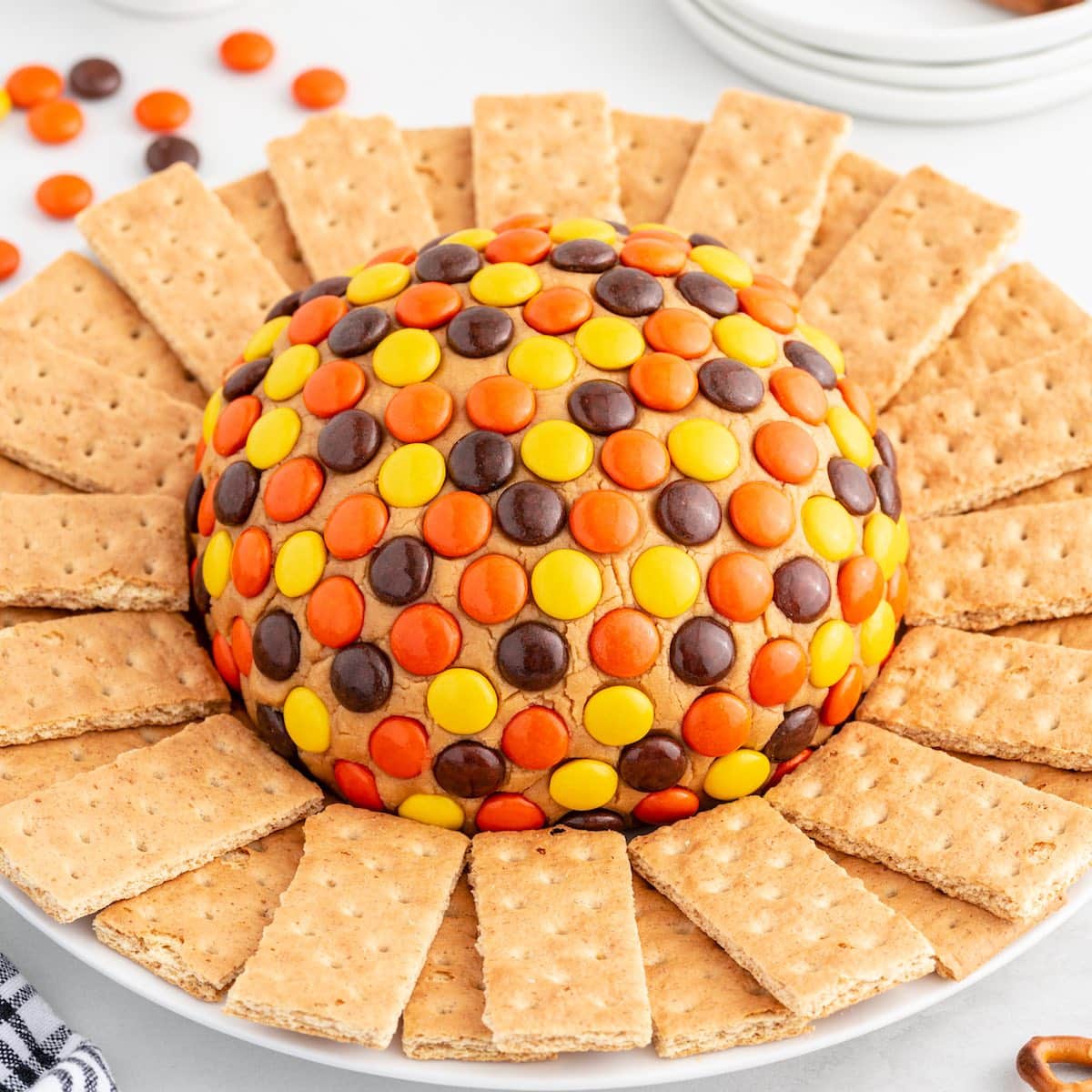 - Lightly press the Reese’s pieces onto the surface of the peanut butter ball. Arrange the graham cracker pieces around the decorated peanut butter ball.
