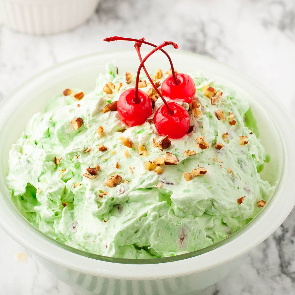 - Transfer the mixture to a serving bowl and refrigerate for at least 1 hour before serving. Garnish with additional chopped pecans and maraschino cherries if desired.
