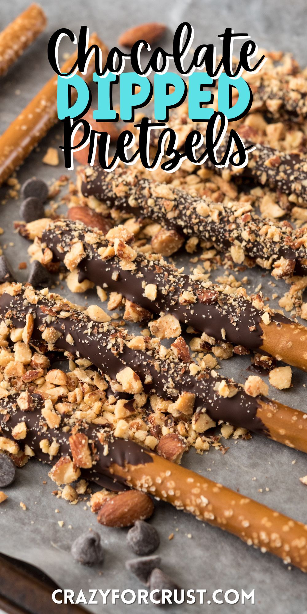 - Dip each pretzel rod in the chocolate as far as you can in the bowl you’re using. If you want the chocolate to come further up the rod than the bowl allows, use a spoon to paint it up the rod. Tap off the excess chocolate, then place the rod on the prepared cookie sheet. Sprinkle with chopped almonds. Repeat until chocolate is gone. Chill to set.