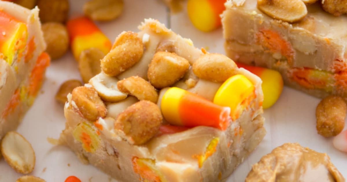 - Remove from heat and stir in vanilla. Working quickly, stir in 1 cup each of the candy corn and peanuts. Quickly spread in prepared pan and top with remaining candy corn and peanuts; press to adhere them to the top.