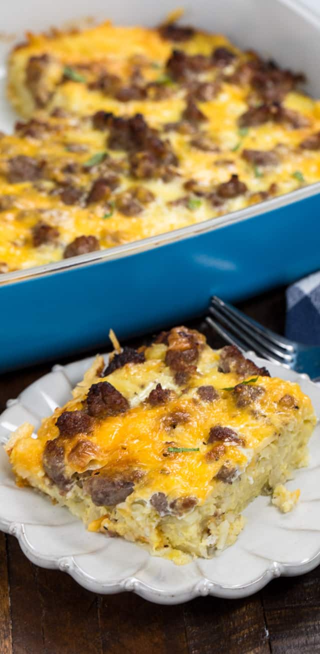 - Sprinkle cooked sausage evenly over hash browns. Top with shredded cheddar cheese.