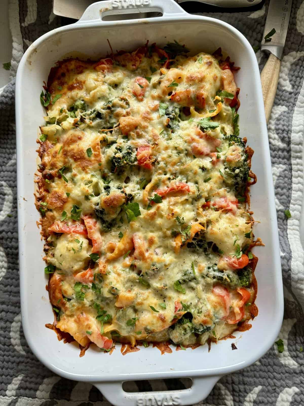- Preheat your oven to 350°F (175°C). Add the drained broccoli, cauliflower, sautéed onion, and sliced red bell pepper to a 9x13 inch baking dish. Spread them out evenly and season with salt and pepper to taste.