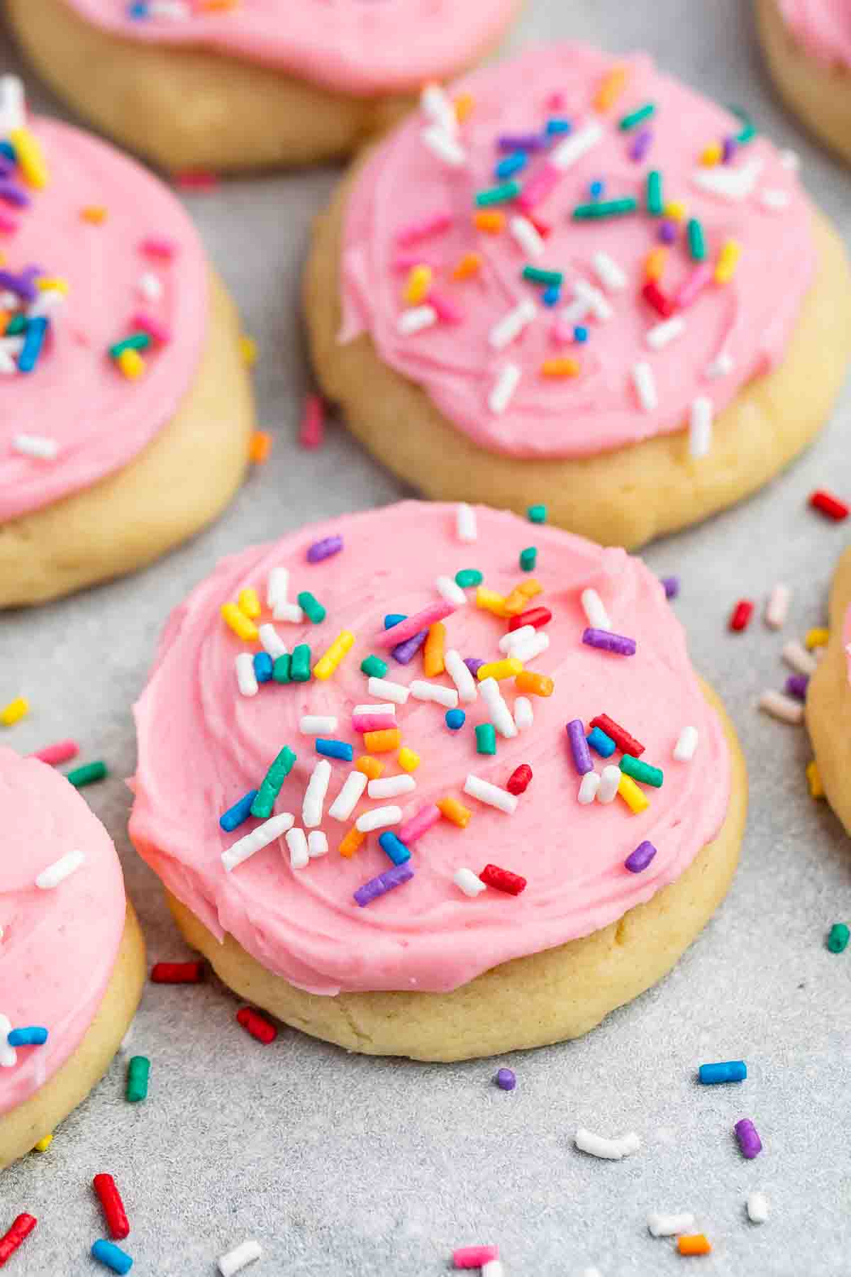 - Frost cooled cookies with about 1 tablespoon of frosting. Decorate with sprinkles.