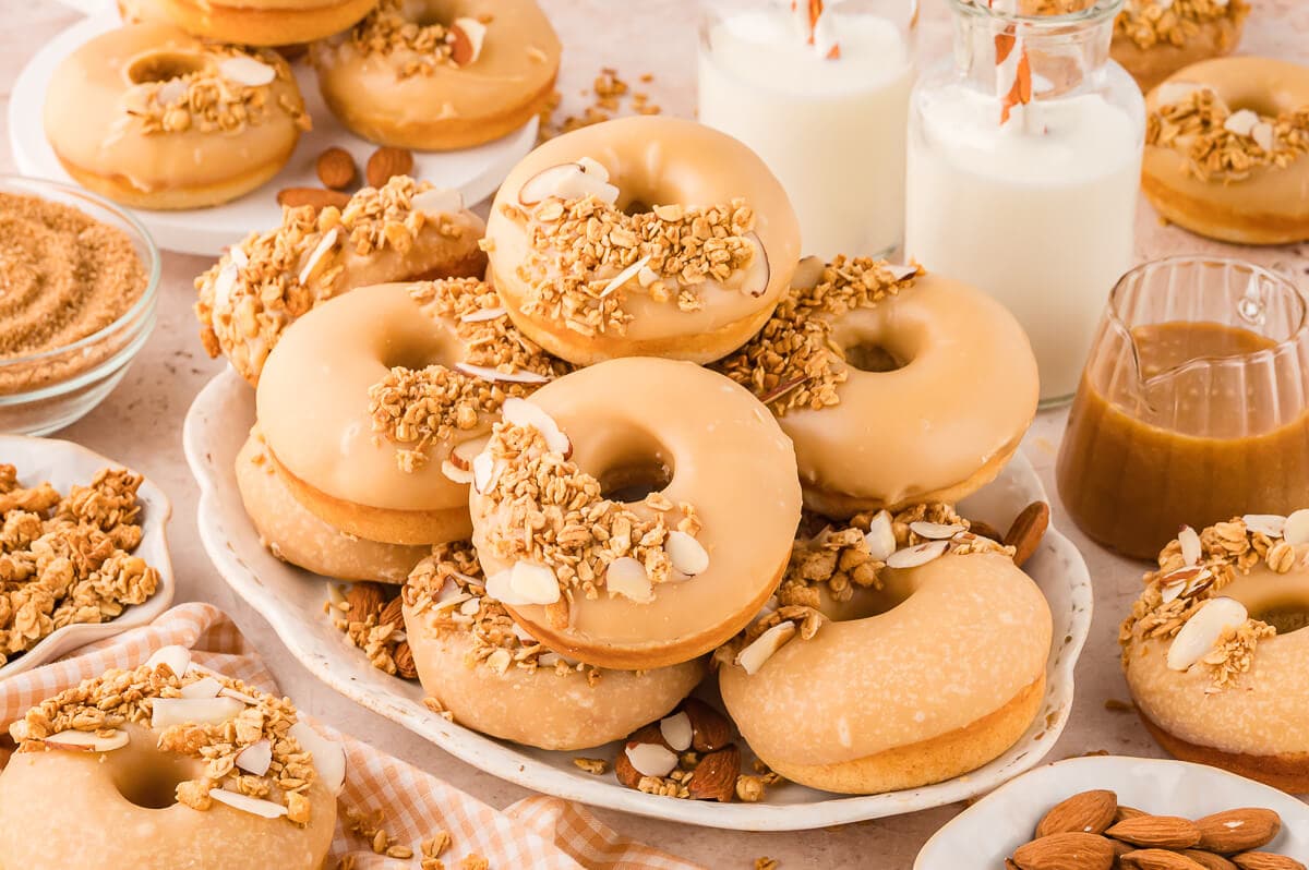 - Dip the tops of the cooled donuts into the warm glaze, letting any excess drip off. Immediately sprinkle with your topping of choice, such as chopped almonds or granola, before the glaze sets.