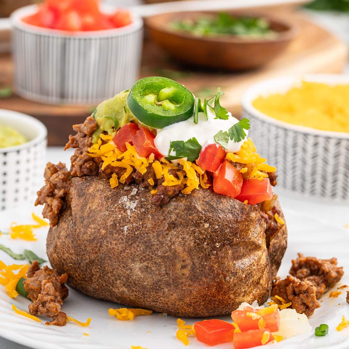 - To fill the taco potatoes, evenly divide the taco-seasoned beef into the opening of each baked potato.