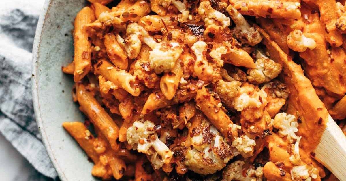 - Cook the pasta according to package directions. Toss with some of the sauce and most of the roasted cauliflower. Garnish with greens if desired.