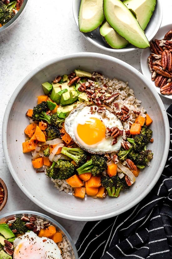 - Divide cooked rice among bowls. Top with roasted vegetables, sliced avocado, fried eggs, and pecans.