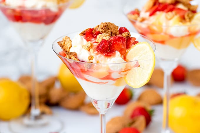- Take three glasses and layer the cream, spoonfuls of strawberry and dots of lemon curd. Sprinkle the top with crumbled amaretti and place a lemon slice on the edge of each glass before serving.